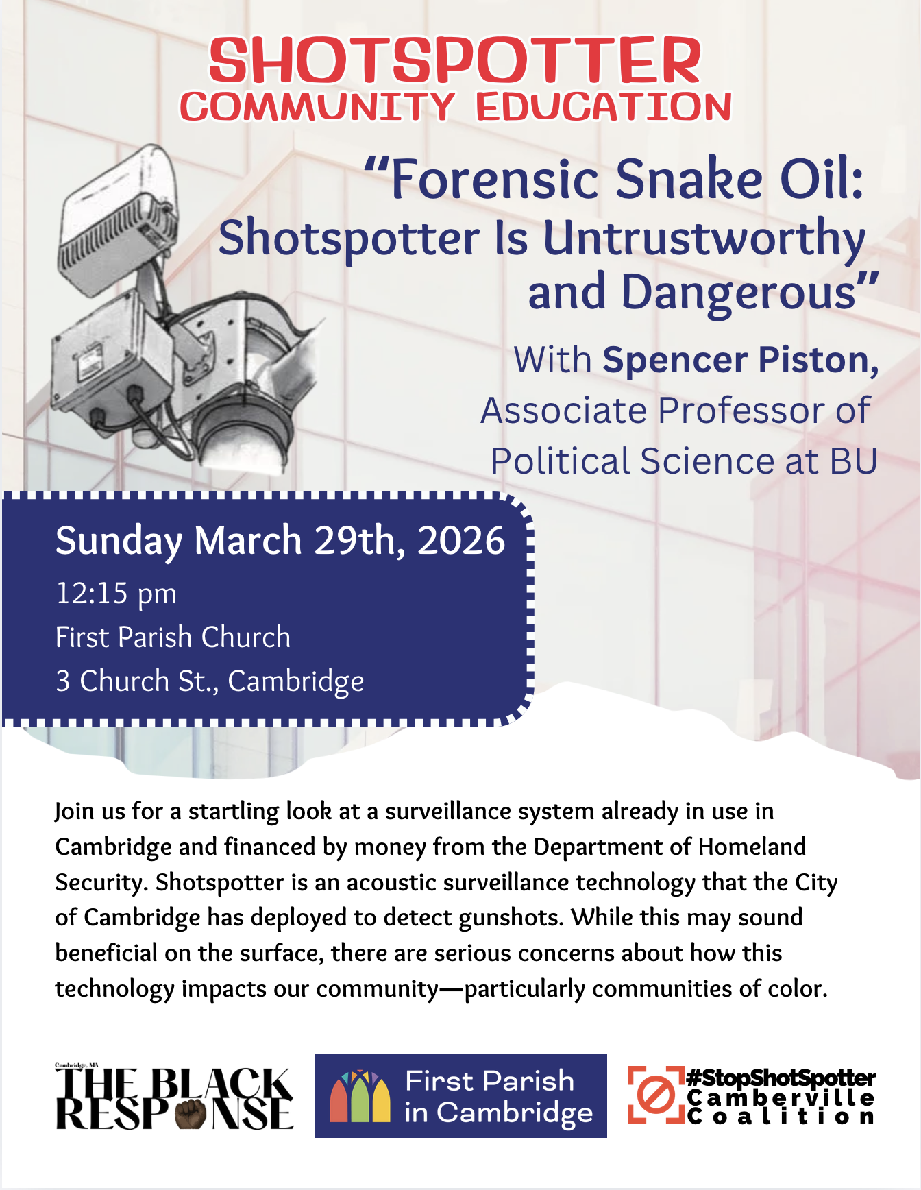 This event is hosted by First Parish Church in Cambridge, The Black Response and the Stop ShotSpotter Coalition. The speaker is Spencer Piston, Associate Professor of Political Science at Boston University.